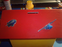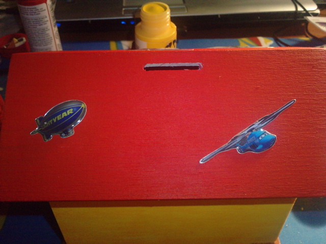 Mealheiro em foma de casa, as “paredes ” em tons de amarelo, o “telhado ” em vermelho e o rebordo da “casa” em castanho.