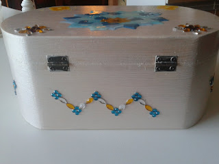 Vista da frente, “fileira” efectuado com strass, as flores em azul, no meio strass branco e amarelo |