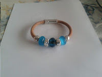 | Cabedal castanho claro com peças de vidro em tons de azul e peças de metal valor: 17 euros ( conjunto; 7 euros caixa e 10 euros pulseira ) |