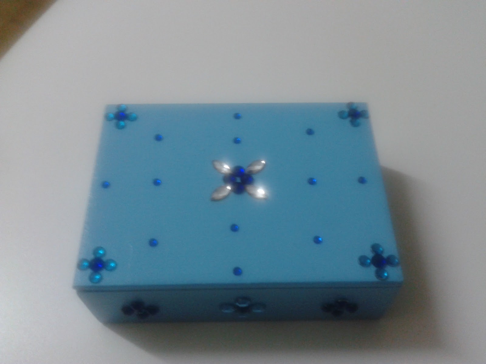 | Fundo em azul a caixa e decorada com strass aplicados em tons de azul, a emitar flores |