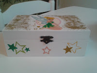 | Com fundo branco, desenhada a fada sininho a volta aplicadas purpurinhas douradas |