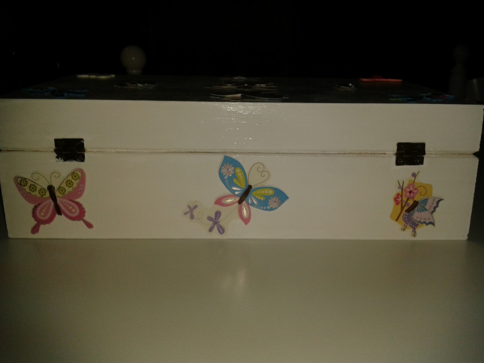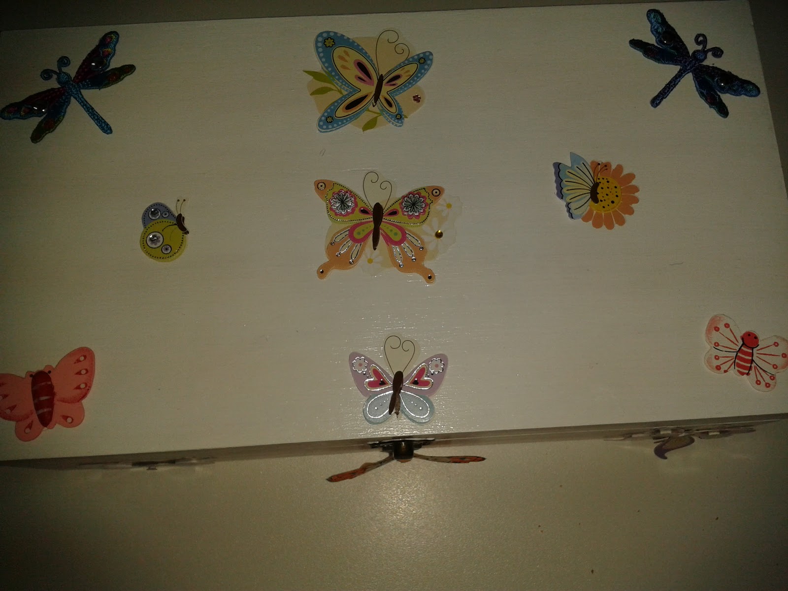 Com fundo branco, com borboletas aplicadas em autolocante, tecido e madeira |