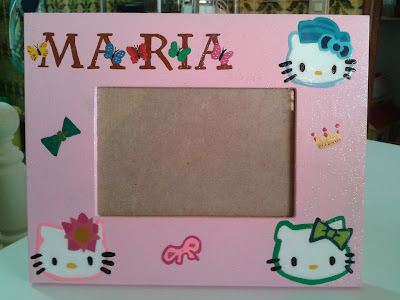 Moldua com fundo rosa, as letras em castanho cm borboletas e varios tons, no canto superio direito cabeça de kitty em tons de azuis, no canto inferior esquerdo em tons de rosa e no canto inferior direito em tons de verde. Nos meios desenhados uma coroa, e dois laços. Aplicada tinta brilhante em todo o trabalho excepto nas kitty’s