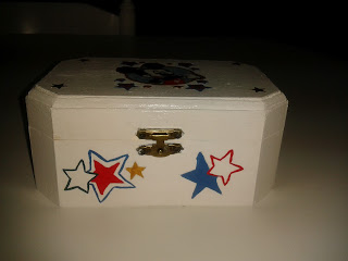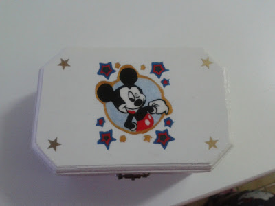 | Com fundo branco, com o mickey no meio, com estrelas vermelhas, azuir e douradas a volta, nos cantos aplicadas estrelas douradas |