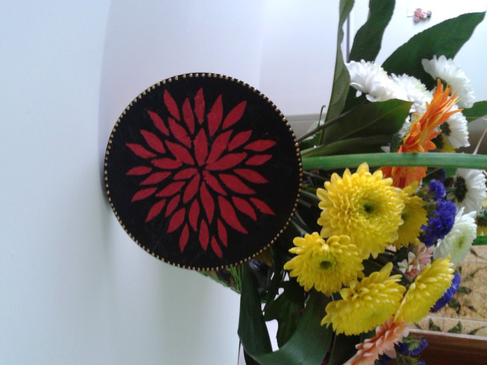 1 de Maio, 2012 Base para os Tachos Sandra Rafael base de tachos, dourado, flor, prelado, preto, vermelho metalizado Fundo preto, no centro com escantilhãofeito uma flor com vermelho metalizadoa contornar prelado dourado
