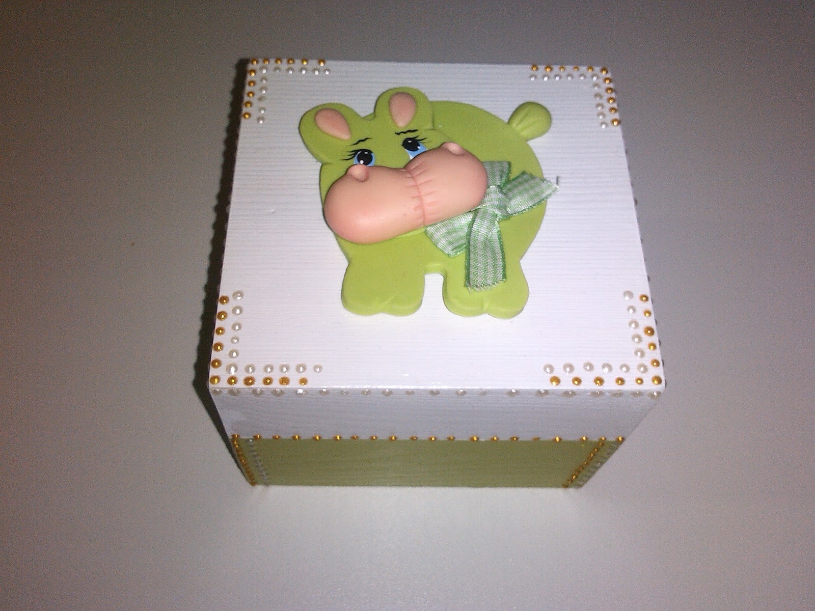 29 de Setembro, 2012 Caixa com Hipopotamo Sandra Rafael biscuit, branco, criança, dourado, hipopotamo, lembrança, madeira, prateado, prelado, verde Caixa com tampo banco e a parte de baixo verdeNo tampo aplicado um hipopotamo em biscuit, nas extremidadesaplicado prelado dourado e prateado