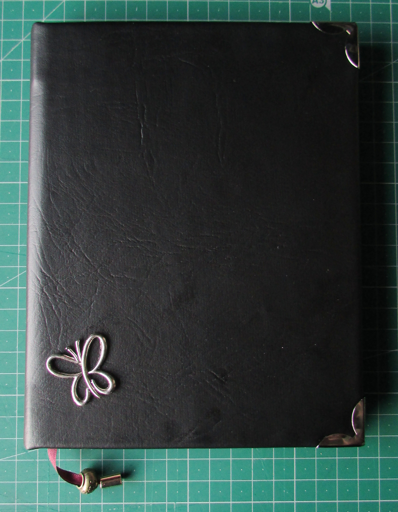 Caderno em Napa preta , com aplicação de cantos metálicos, fita bordou para marcação de pagina e aplicação de borboleta |