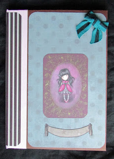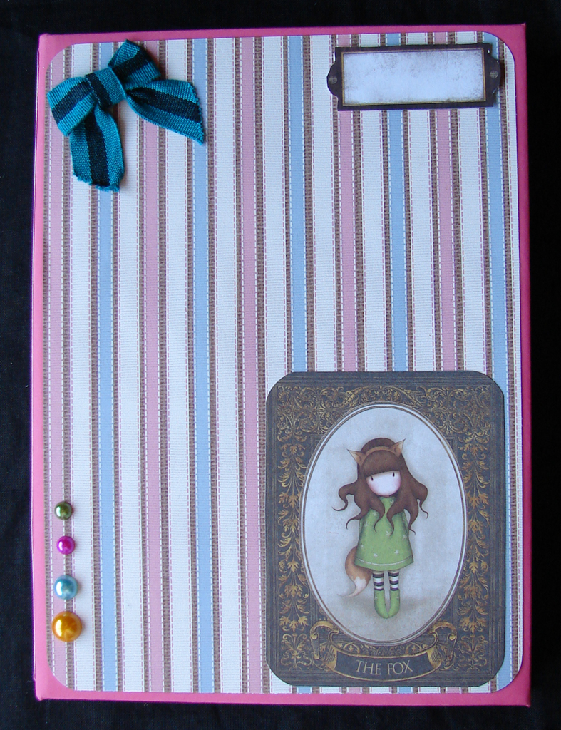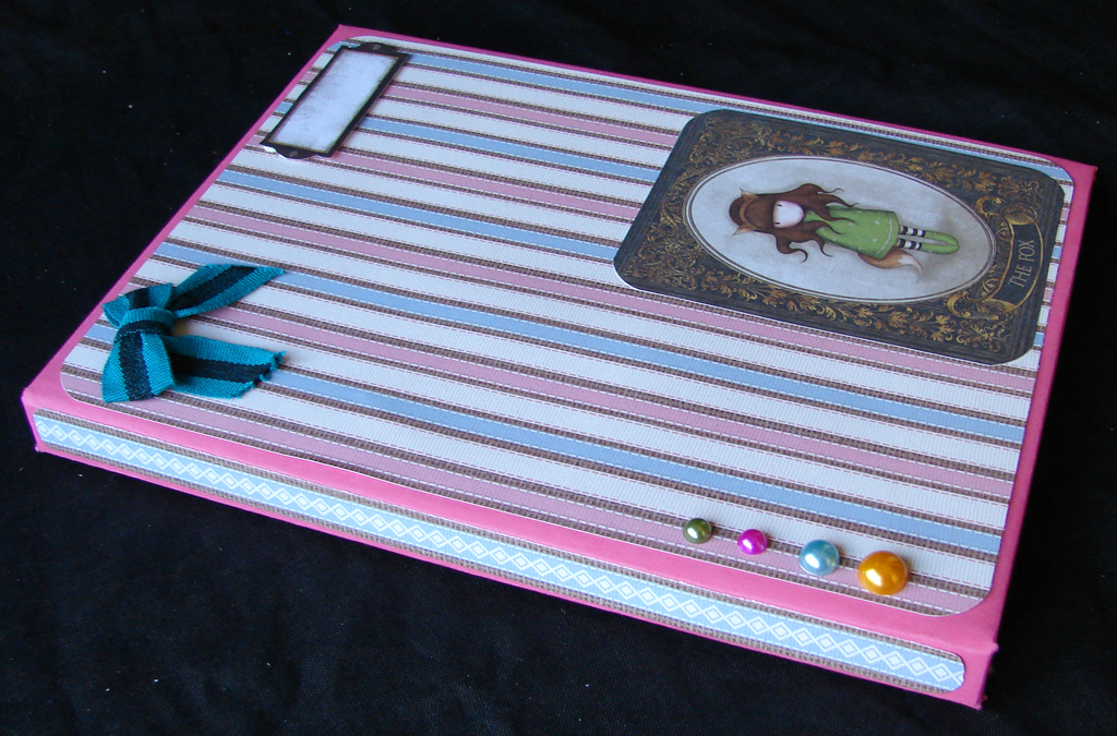 Caderno com o tamanho cerca de A5, com 50 folhas em cartolina rosa escuro, decorado com papel de scrap aplicações com tema das gorjuss e meias pérolas e laço |