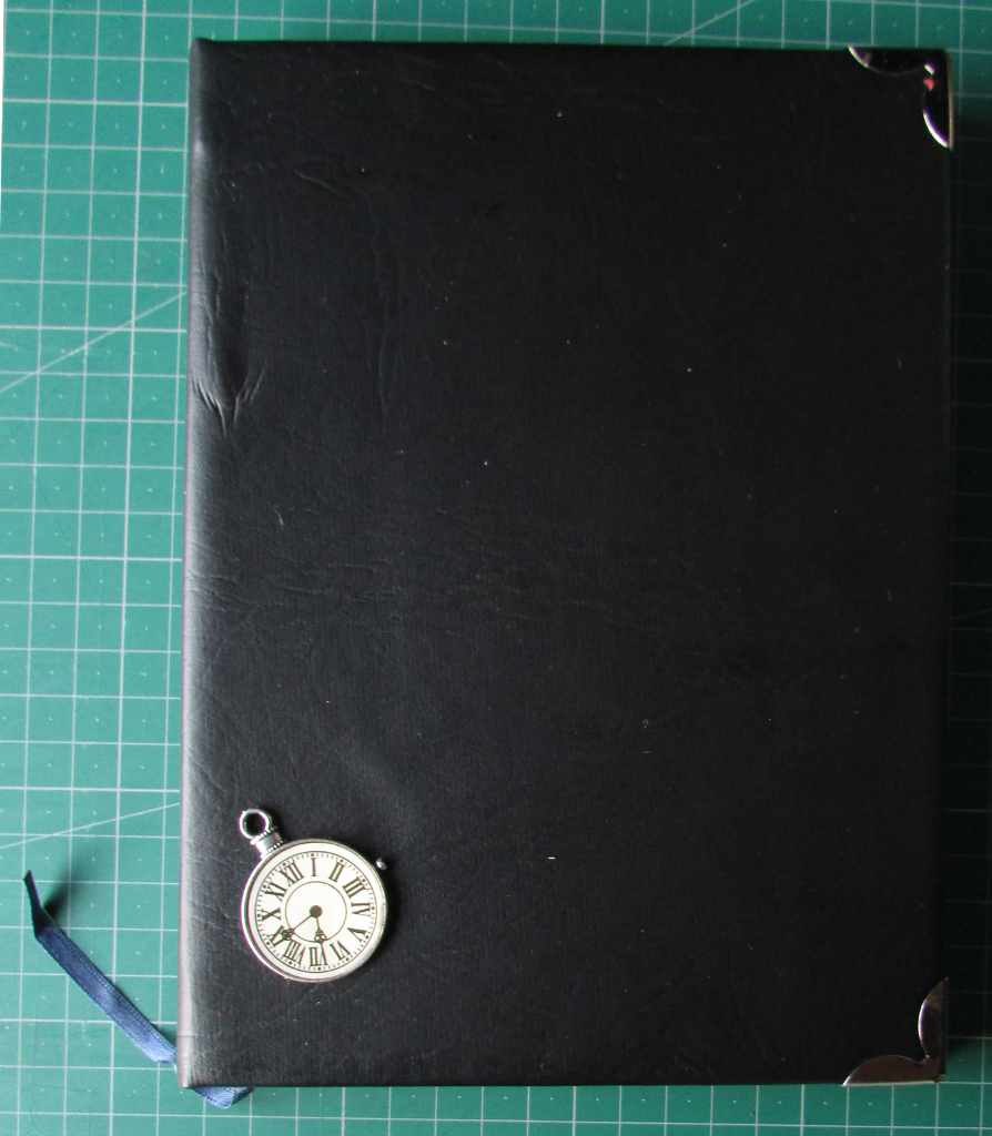 Caderno em Napa preta , com aplicação de cantos metálicos, fita azul para marcação de pagina e aplicação de relógio |