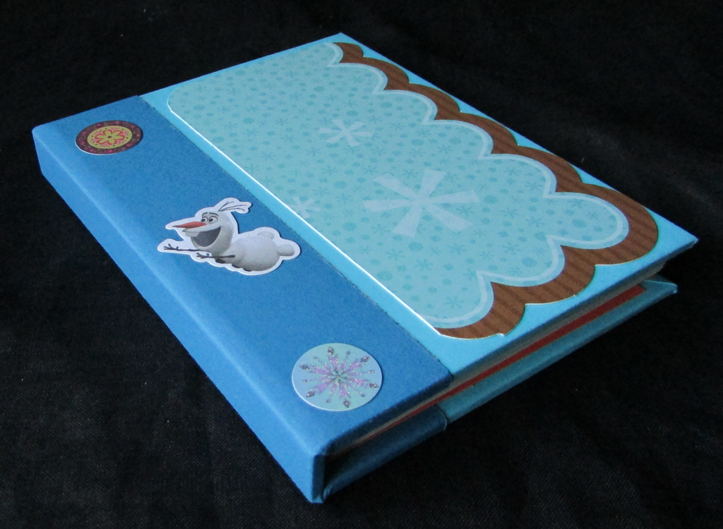 Caderno com tamanho cerca de A6 com cerca de 60 folhas, lombada em cartolina azul escuro, o resto em azul claro decorado com papeis do tema Frozen e autocolantes |