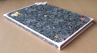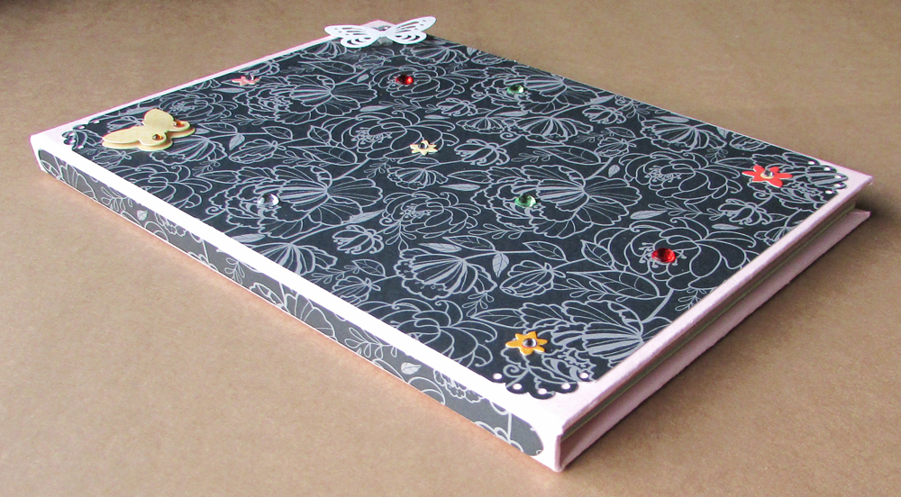 Caderno tamanho cerca de A5 com 50 folhas , fundo com cartolina rosa , decorado com papel scrap preto florido com aplicação de flores e borboletas |